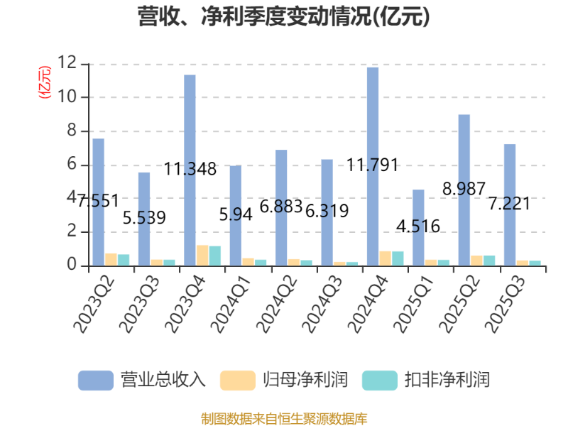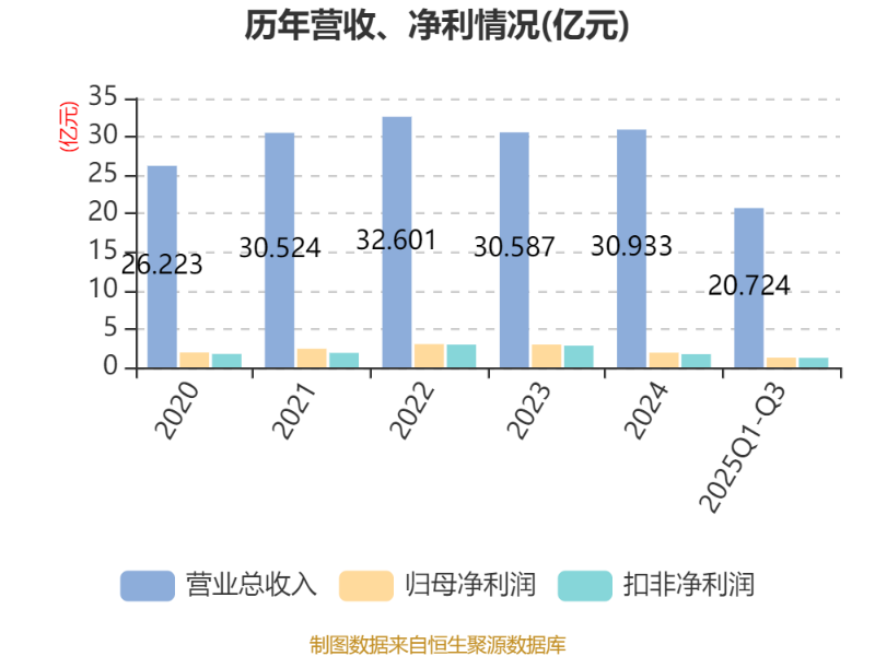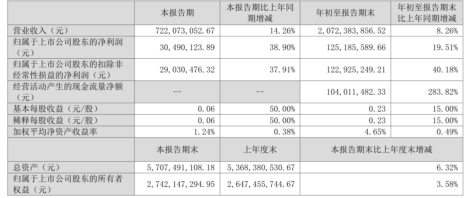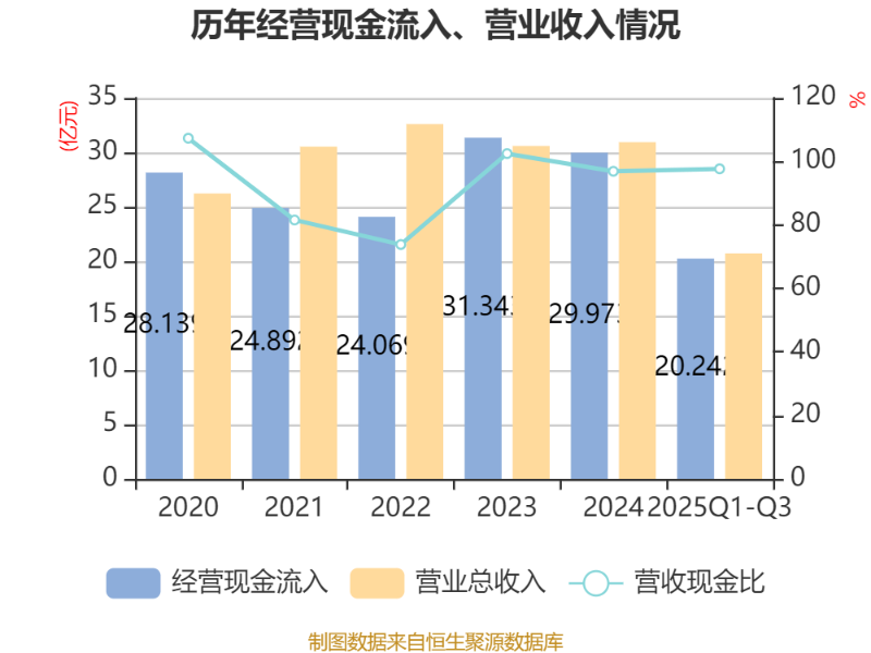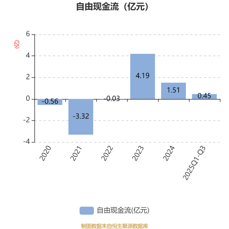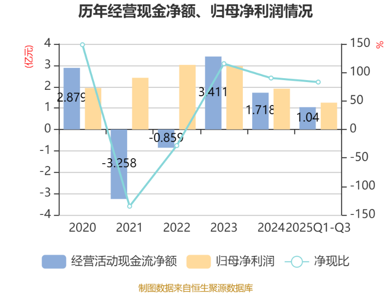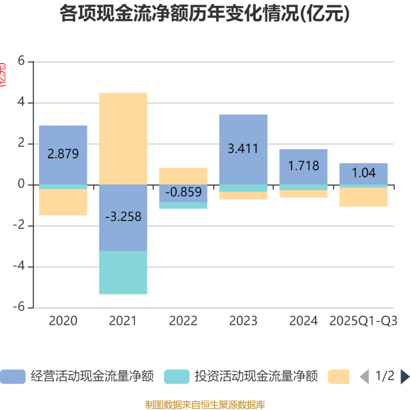 2025年前三季度,公司经营活动现金流净额为1.04亿元,同比增加1.61亿元;筹资活动现金流净额-9139.19万元,同比增加9139.52万元;投资活动现金流净额-1652.63万元,上年同期为-1345.05万元。