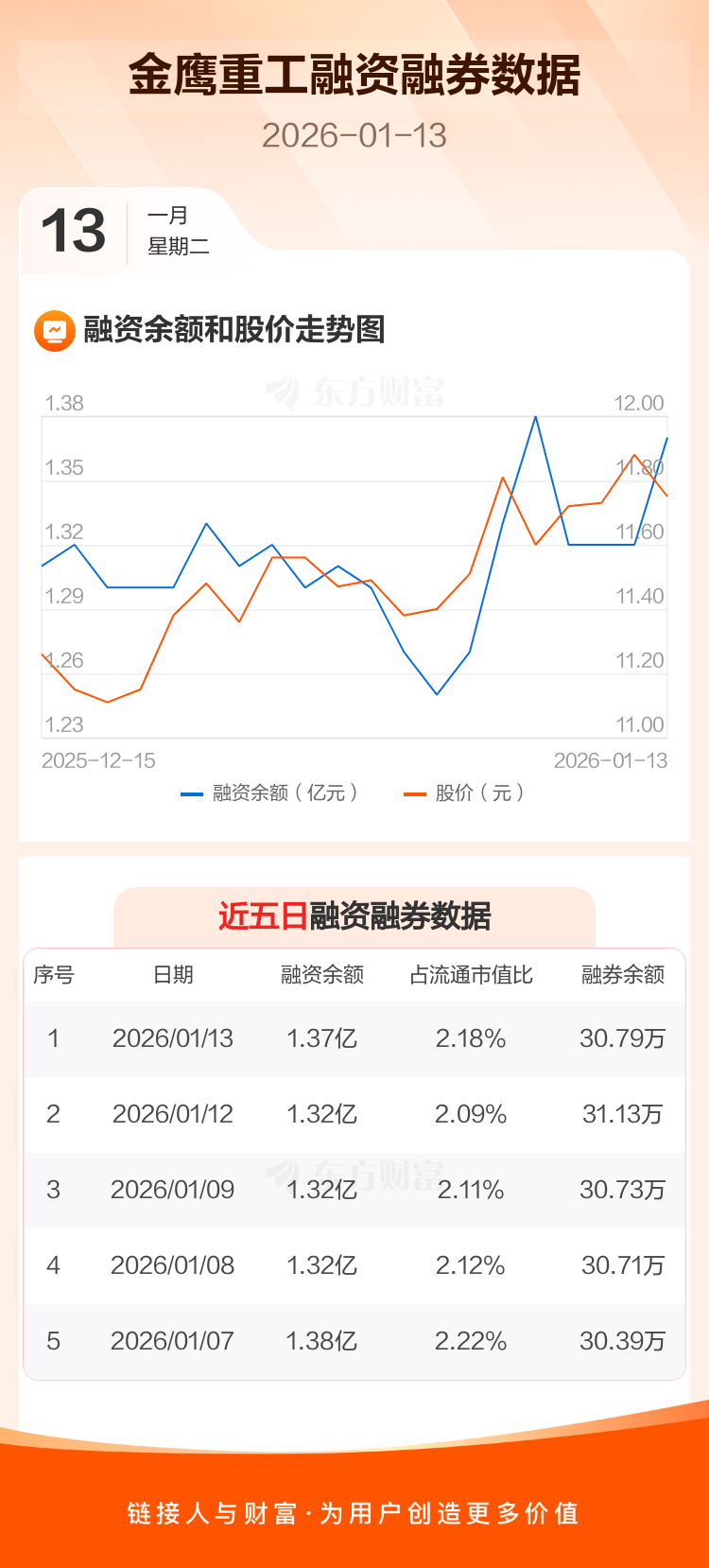 交易所最新数据显示,金鹰重工于2026年1月13日获融资买入1124.76万元,融资偿还682.82万元,当日融资净买入441.94万元。目前,该股融资余额1.37亿,占流通市值比例为2.18%。