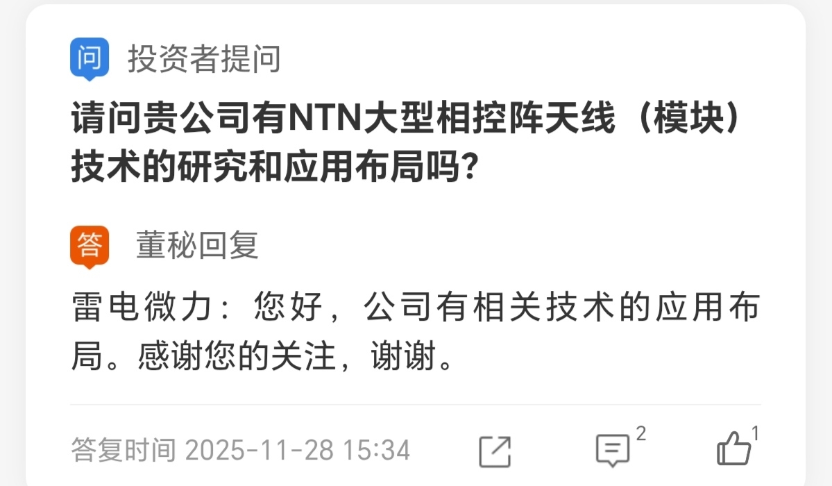 $雷电微力(SZ301050)$ NTN天线中兴通讯己经验证成功了,雷电加油