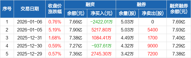 雷电微力:融资净偿还2422.01万元,融资余额7.66亿元(01-06)