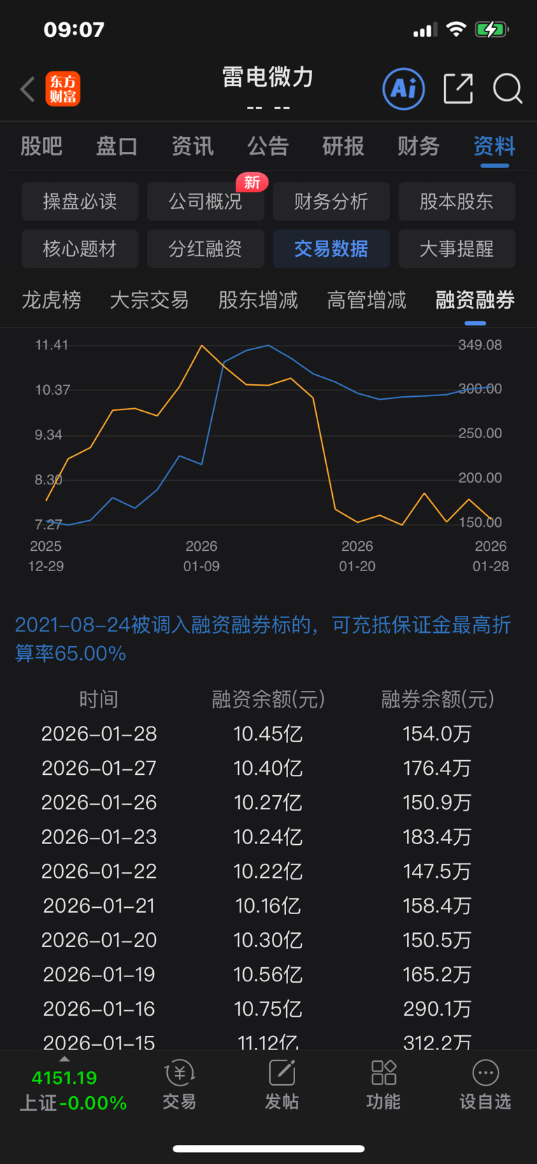 $雷电微力(SZ301050)$ 雷电微力:融资余额继续增加,说明看好股票,慢慢加仓,希望再创新高。