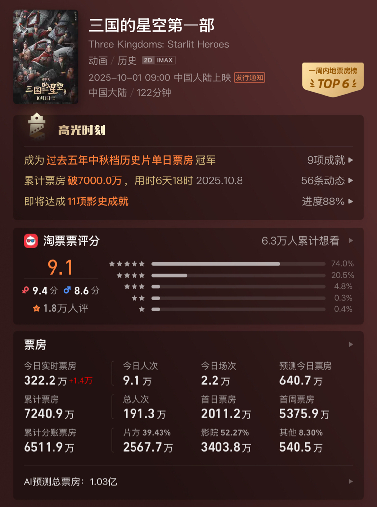 $果麦文化(SZ301052)$ 星空扑街了,预计就是一个亿的票房,所有参与投资的片方一共才分4000万,果麦再分40%,小亏2000多万吧。三国题材没有封神题材卖座呀。要不然别拍第二部了,拍西游记这些吧。曾经让我满仓赚了20个点的票,明天再来看看吧