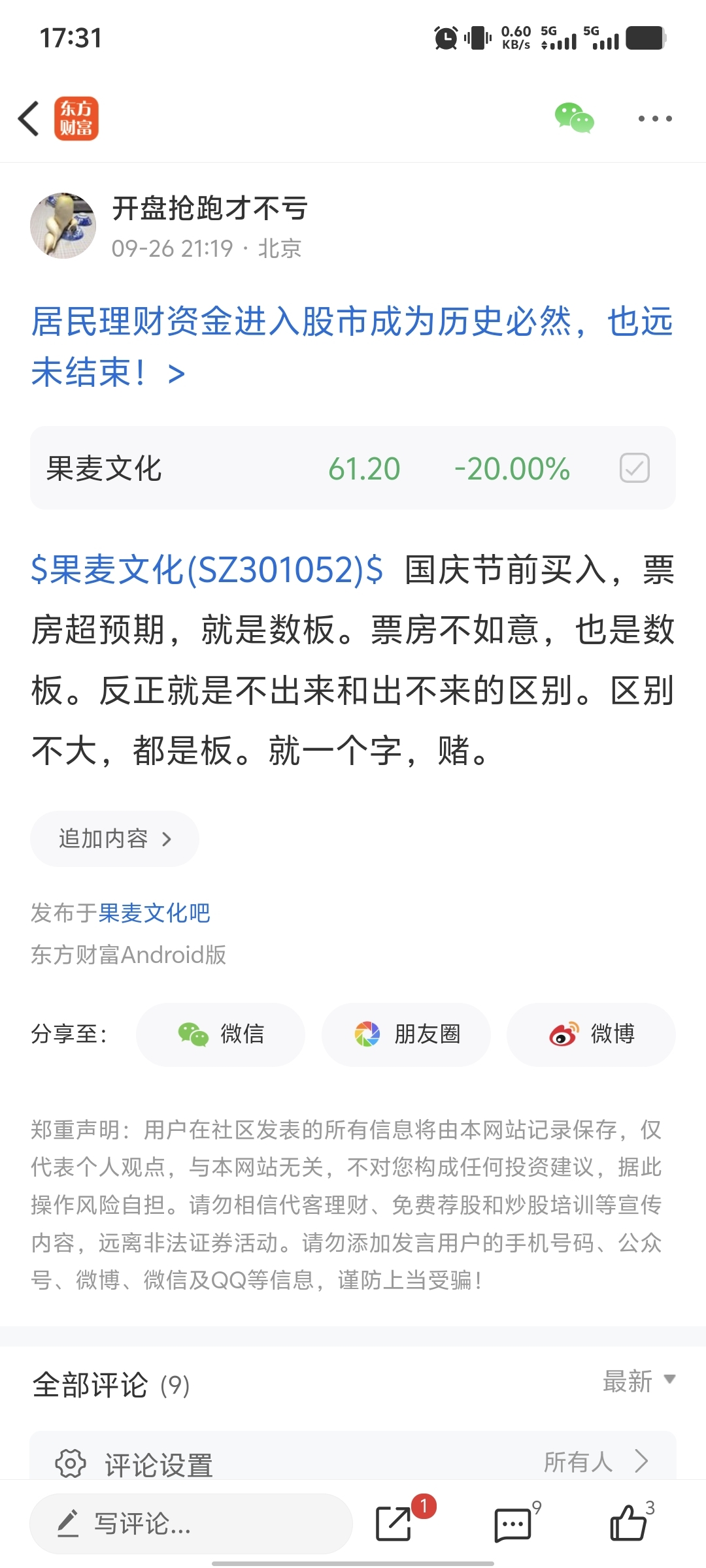 $果麦文化(SZ301052)$ 节前的预感,还好没买啊!!