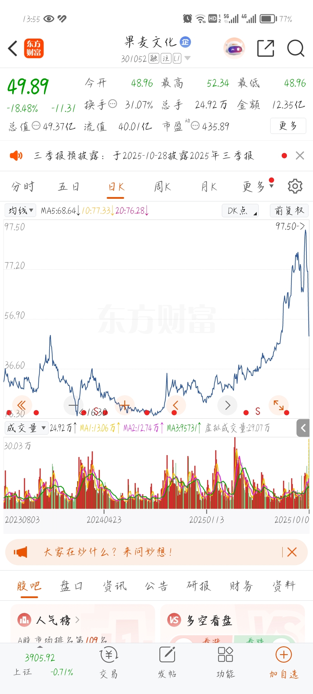 $果麦文化(SZ301052)$ 没啥利空?为啥最近狠跌?