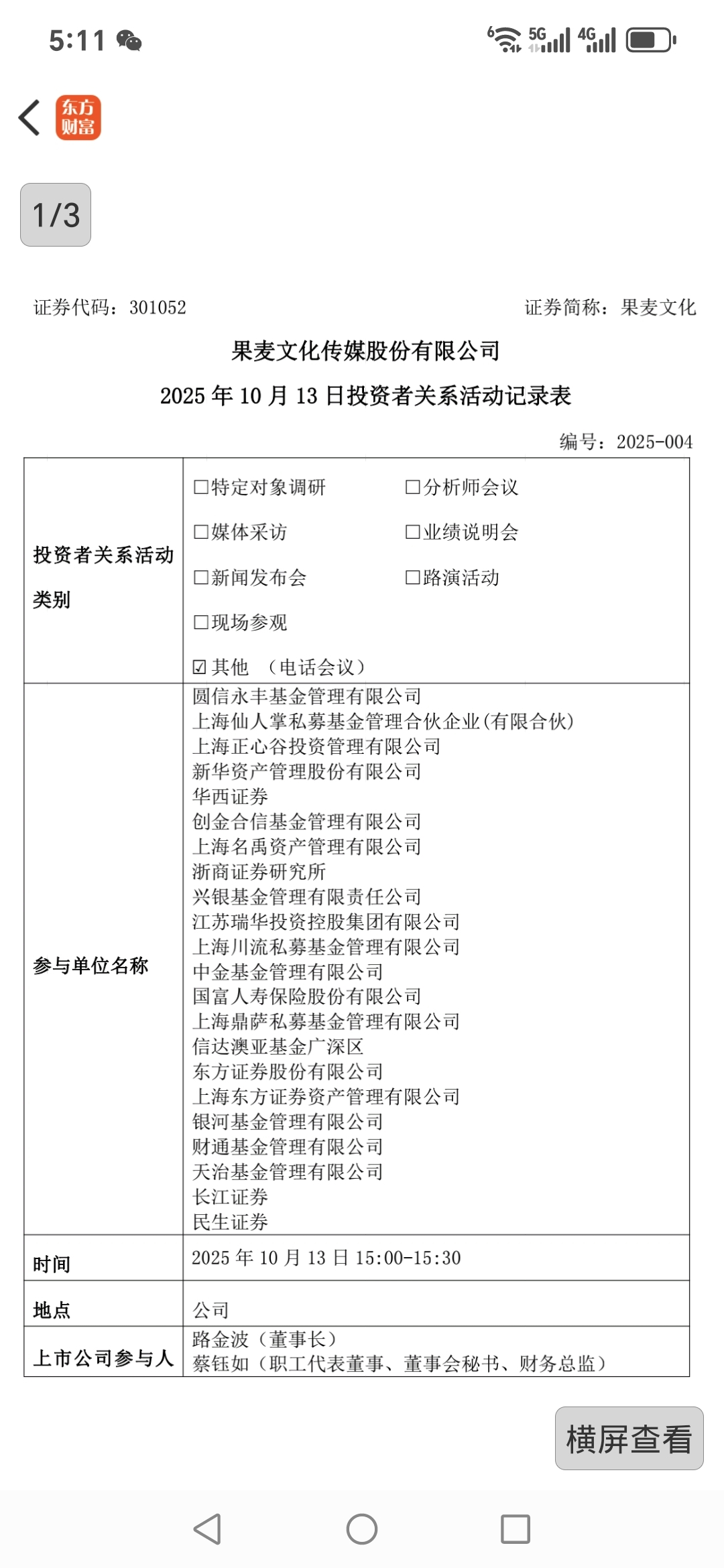 $果麦文化(SZ301052)$ 【调研快报】果麦文化接待圆信永丰基金管理有限公司等多家机构调研$北方稀土(SH600111)$ $金力永磁(SZ300748)$