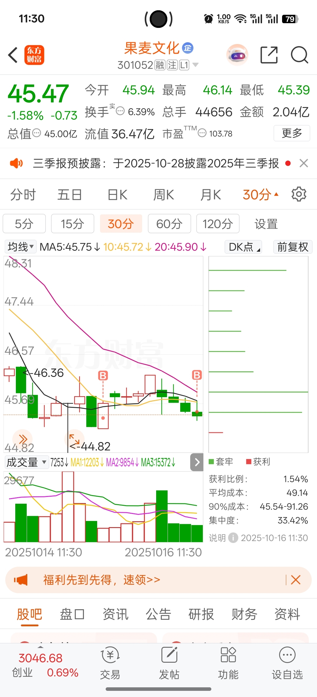 $果麦文化(SZ301052)$ 45.5都能亏,这个票,我真服了,明天不反弹就跑。