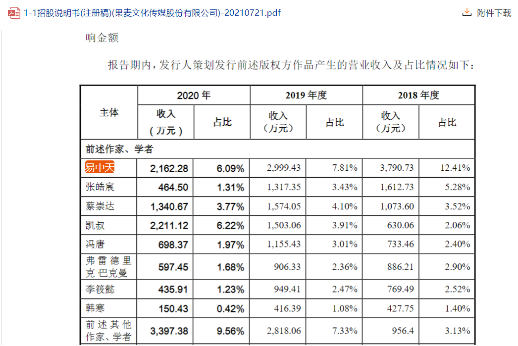 相比韩寒,易中天作品给果麦文化带来的营收,2018-2020年期间远高于韩寒。截至2020年底,易中天《中华史》系列图书产品的销量已超百万册。