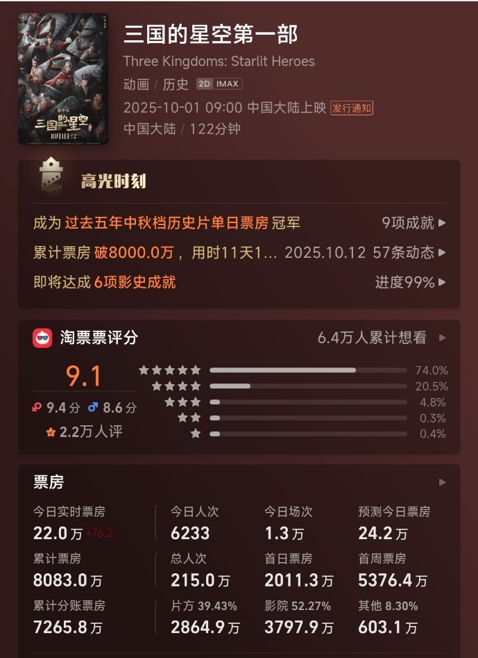 不难发现,上映首日票房高峰后,影片的口碑并未带来更高票房,也未给投资方带来预期收益。上映14天,《三国的星空第一部》累计分账票房7265.8万元,片方能获得39.43%票房收入约2864.9万元,尚不及影片投资成本60%。即便按AI预测的影片总票房不超9000万元,影片最终难收回投资成本也是大概率事件。