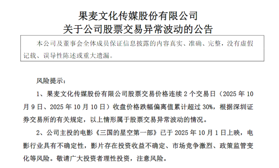 《三国的星空第一部》票房惨淡,让果麦文化节后两个交易日股价下跌超30%。公司为此特意发了股票交易异常波动的公告,并在投资者活动中进行了复盘总结。