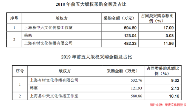 易中天和韩寒均为果麦文化作者,二者占据了果麦文化2018年和2019年的前两大版权采购商。