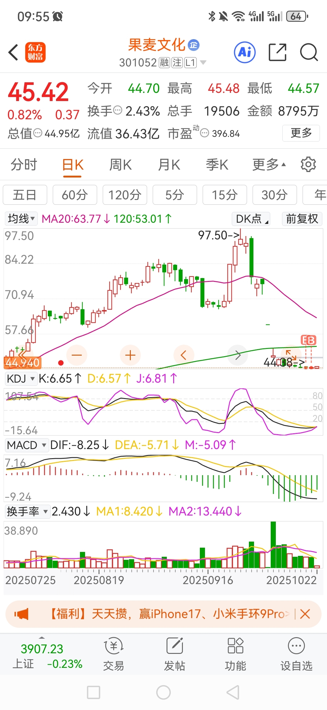 $果麦文化(SZ301052)$ 顶部要割肉的快点割,即使是缩量也是10%的换手率。来博弈反弹,反弹触摸到20日线就可以抛售了。不过顶部的价格休想看到。