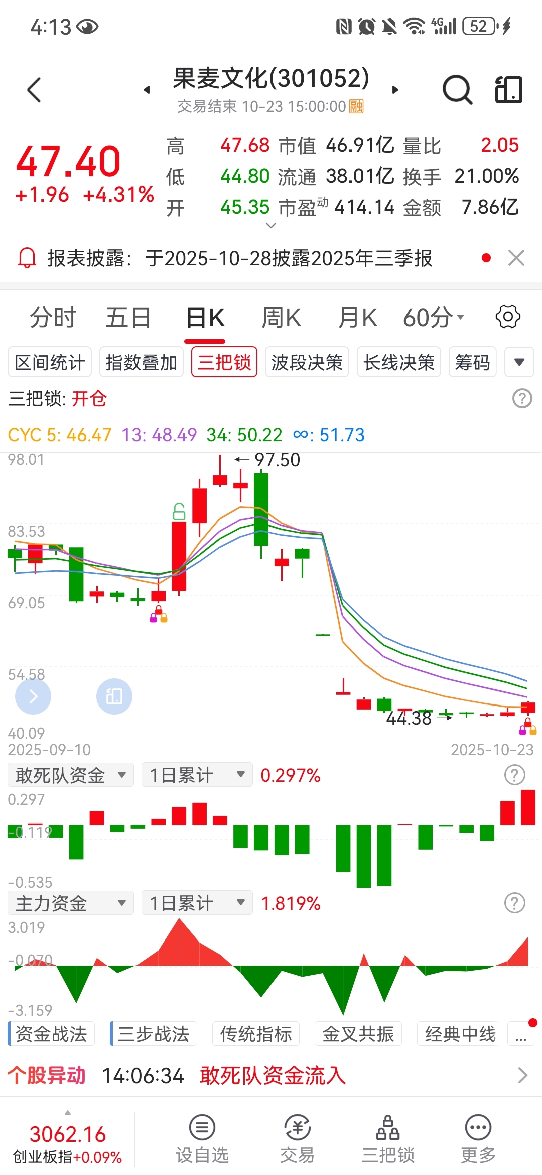 $果麦文化(SZ301052)$ 花100多块钱买了个三把锁软件,提示可以进了,不知道准不准,明天先打个底仓