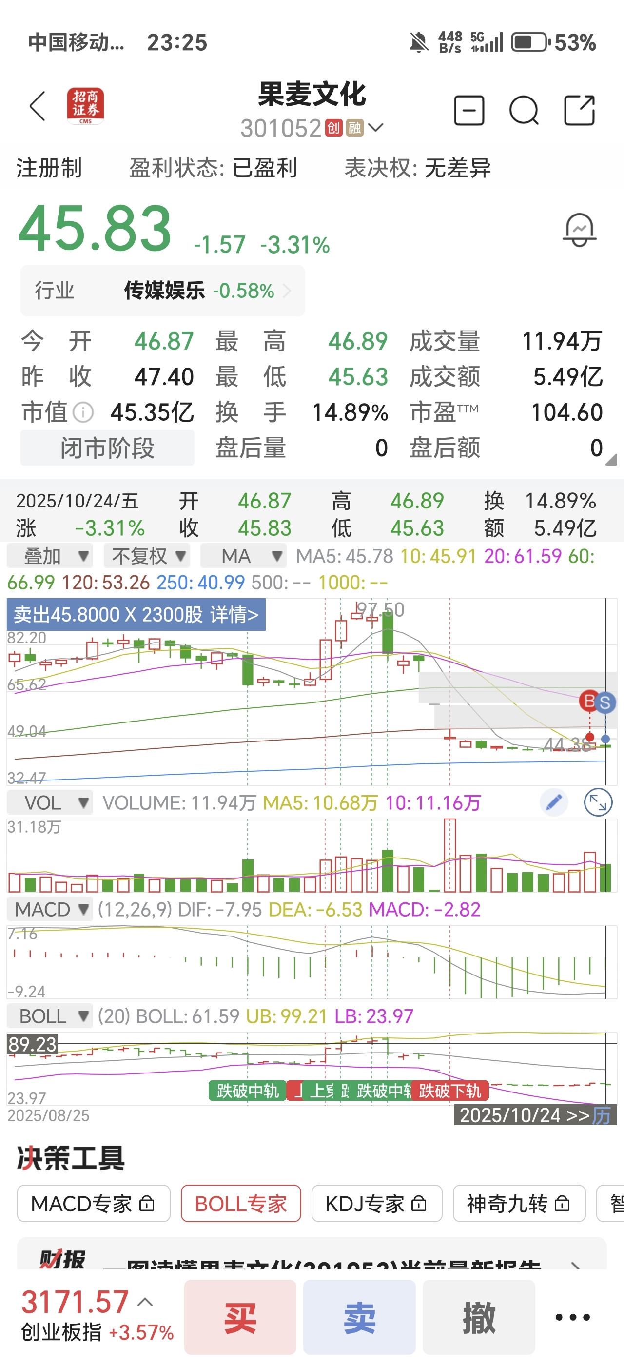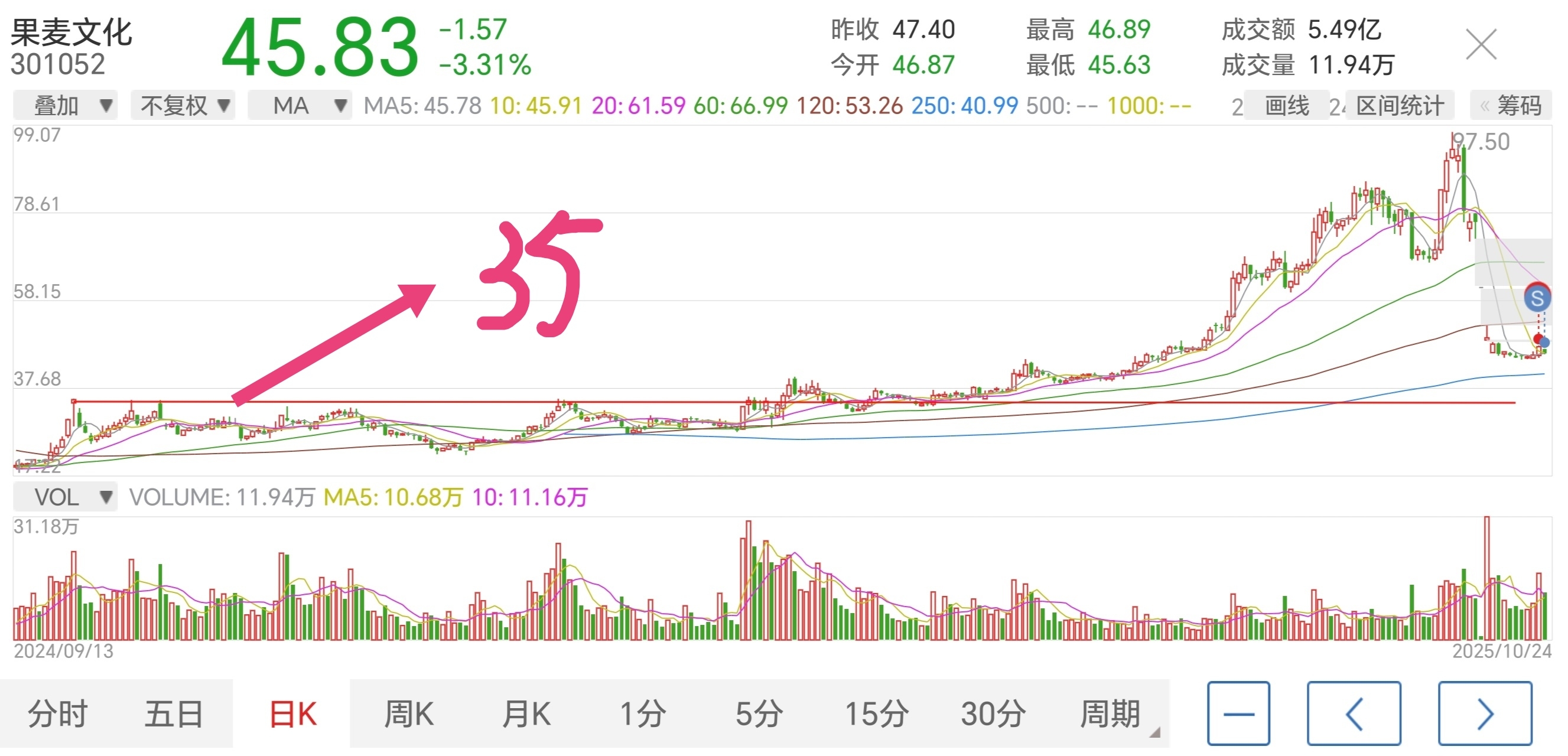 $果麦文化(SZ301052)$ 试了一把亏3900元及时止损出了,感觉是下跌中继,反弹乏力,大底估计会在35元左右,纯属个人观点。