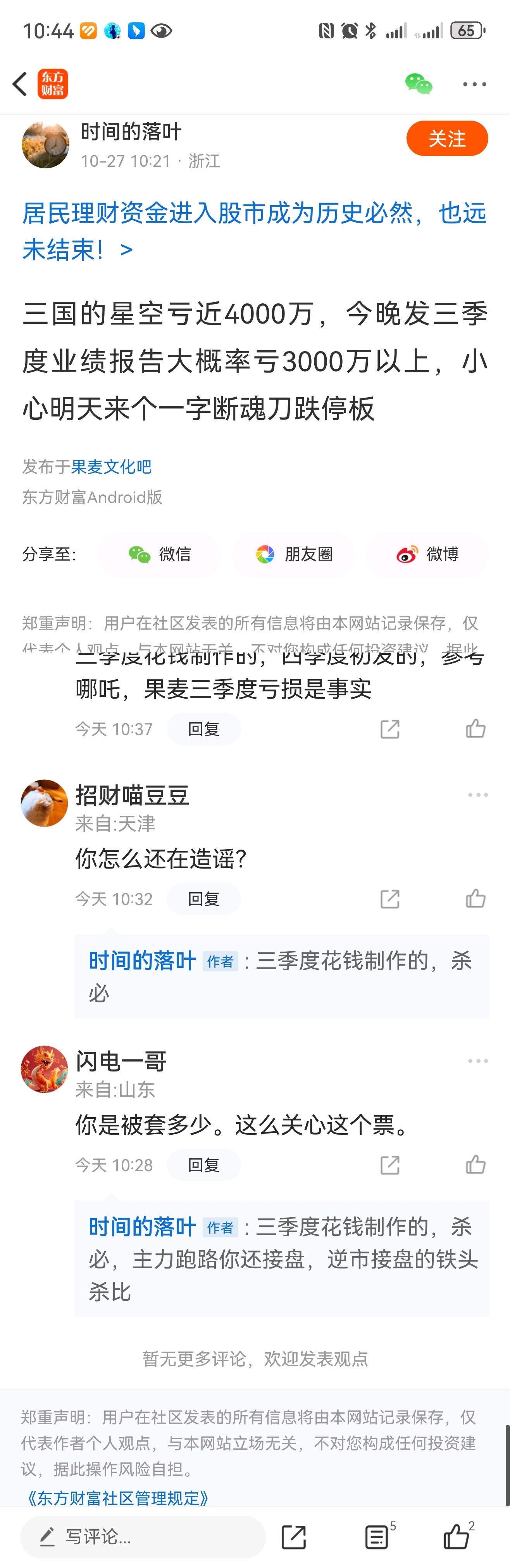 $果麦文化(SZ301052)$ 这个“时间的落叶”到处造谣果麦3季度亏3000万,还恶语伤人、狺狺狂吠。大家好心给他科普会计核算知识,他还狡辩,不停的发帖、发亏损3000万的评论。傍晚季报出来后“畏罪潜逃”了,掩耳盗铃般拉黑别人,可笑至极!以下是他的其中一贴: