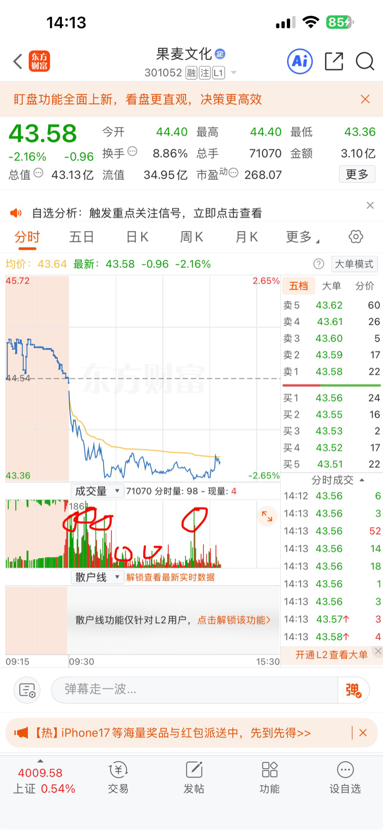 $果麦文化(SZ301052)$ 这主力砸的不要不要的,堆量砸,放巨量砸,大单砸!就散户在那几手几手的买!