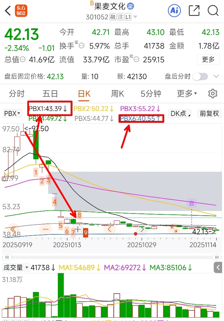 $果麦文化(SZ301052)$ 急跌已经过去了,目前就是在消化套牢盘,短期就是震荡行情,想买的必须做好长线准备,分批低吸建仓,周一就是第一次买点,连续地量介入建仓布局。什么时候连续3天站上PBX1才算是强势修复,PBX6就是左侧低吸建仓,缺点是没有确定性,所以分仓要分仓。横盘买入的筹码大多45块钱附近,强压力位。