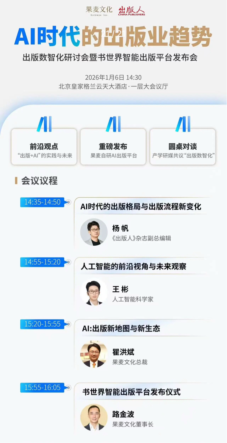 $果麦文化(SZ301052)$ 2026年1月6号,果麦要发布一个ai自研出版平台