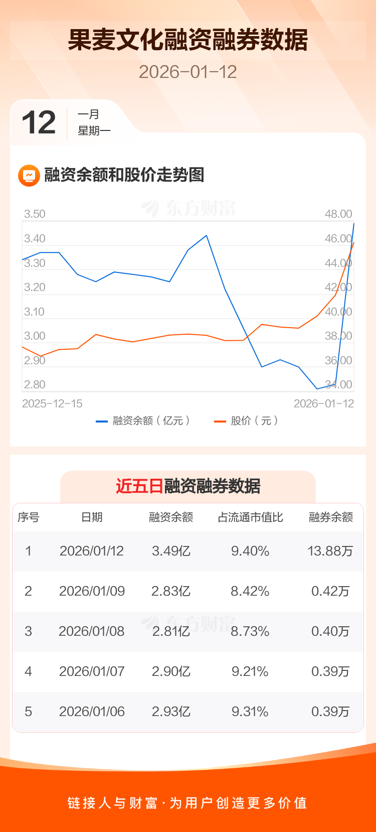 交易所最新数据显示,果麦文化于2026年1月12日获融资买入1.62亿元,融资偿还9581.63万元,当日融资净买入6584.5万元。目前,该股融资余额3.49亿,占流通市值比例为9.40%。