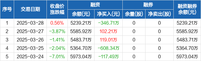 远信工业:融资净偿还346.71万元,融资余额5239.21万元(03-28)