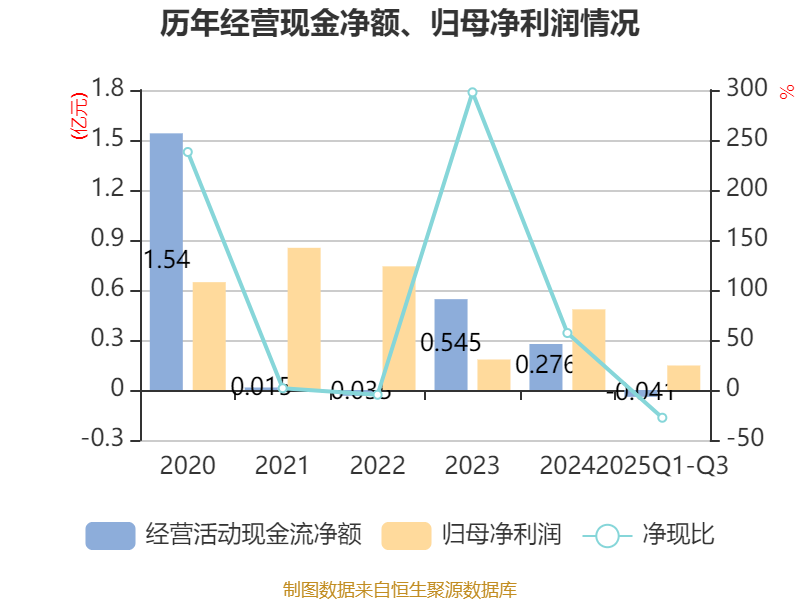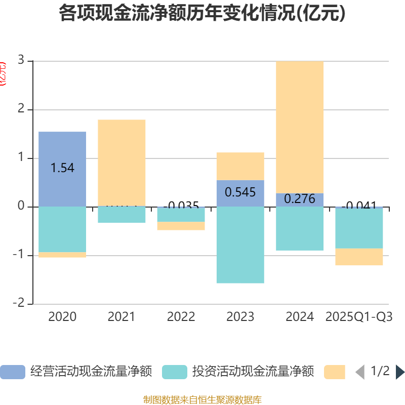 2025年前三季度,公司经营活动现金流净额为-407.97万元,同比增加1579.28万元;筹资活动现金流净额-3457.53万元,同比减少3.1亿元;投资活动现金流净额-8222.76万元,上年同期为-7507.96万元。