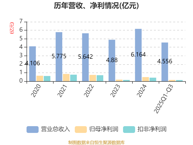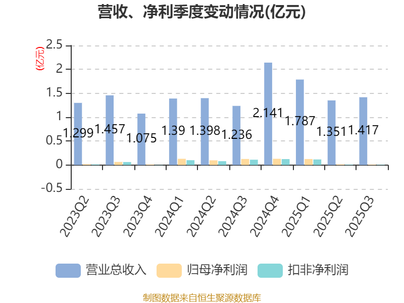 中证智能财讯远信工业(301053)10月30日披露2025年第三季度报告。前三季度公司实现营业总收入4.56亿元,同比增长13.25%;归母净利润1471.22万元,同比下降58.39%;扣非净利润1336.42万元,同比下降54.29%;经营活动产生的现金流量净额为-407.97万元,上年同期为-1987.25万元;报告期内,远信工业基本每股收益为0.18元,加权平均净资产收益率为2.07%。