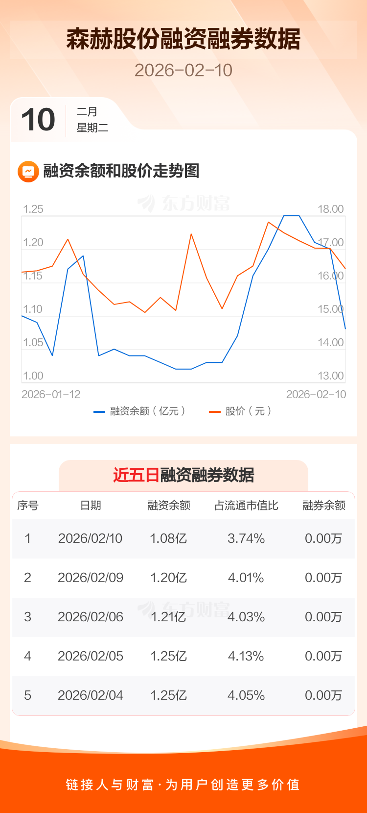交易所最新数据显示,森赫股份于2026年2月10日获融资买入590.44万元,融资偿还1788.60万元,当日融资净偿还1198.16万元。目前,该股融资余额1.08亿,占流通市值比例为3.74%。