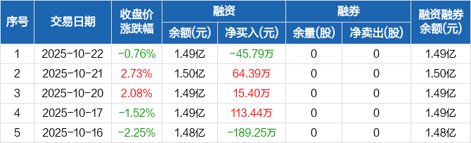 汇隆新材:融资净偿还45.79万元,融资余额1.49亿元(10-22)