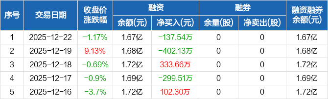 汇隆新材:融资净偿还137.54万元,融资余额1.67亿元(12-22)