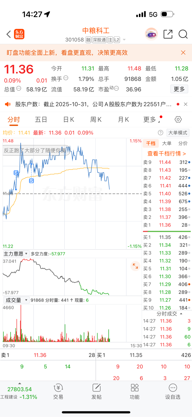 $中粮科工(SZ301058)$ 走了墨迹股,大盘也不好