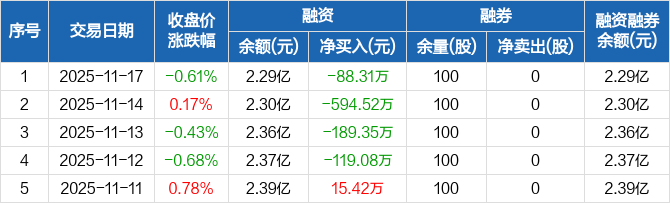 融资方面,当日融资买入1093.55万元,融资偿还1181.87万元,融资净偿还88.31万元,连续4日净偿还累计991.26万元。融券方面,融券卖出0股,融券偿还0股,融券余量100股,融券余额1150元。融资融券余额合计2.29亿元。