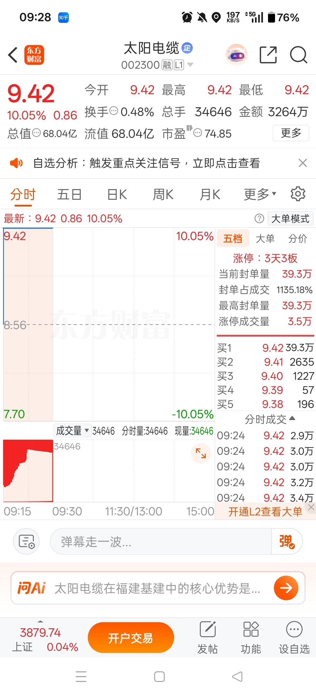 $中粮科工(SZ301058)$ $太阳电缆(SZ002300)$ 不愧是太阳,一字板顶起,这去哪里说理去,盛良别磨叽了,快点减持砸到9块去。