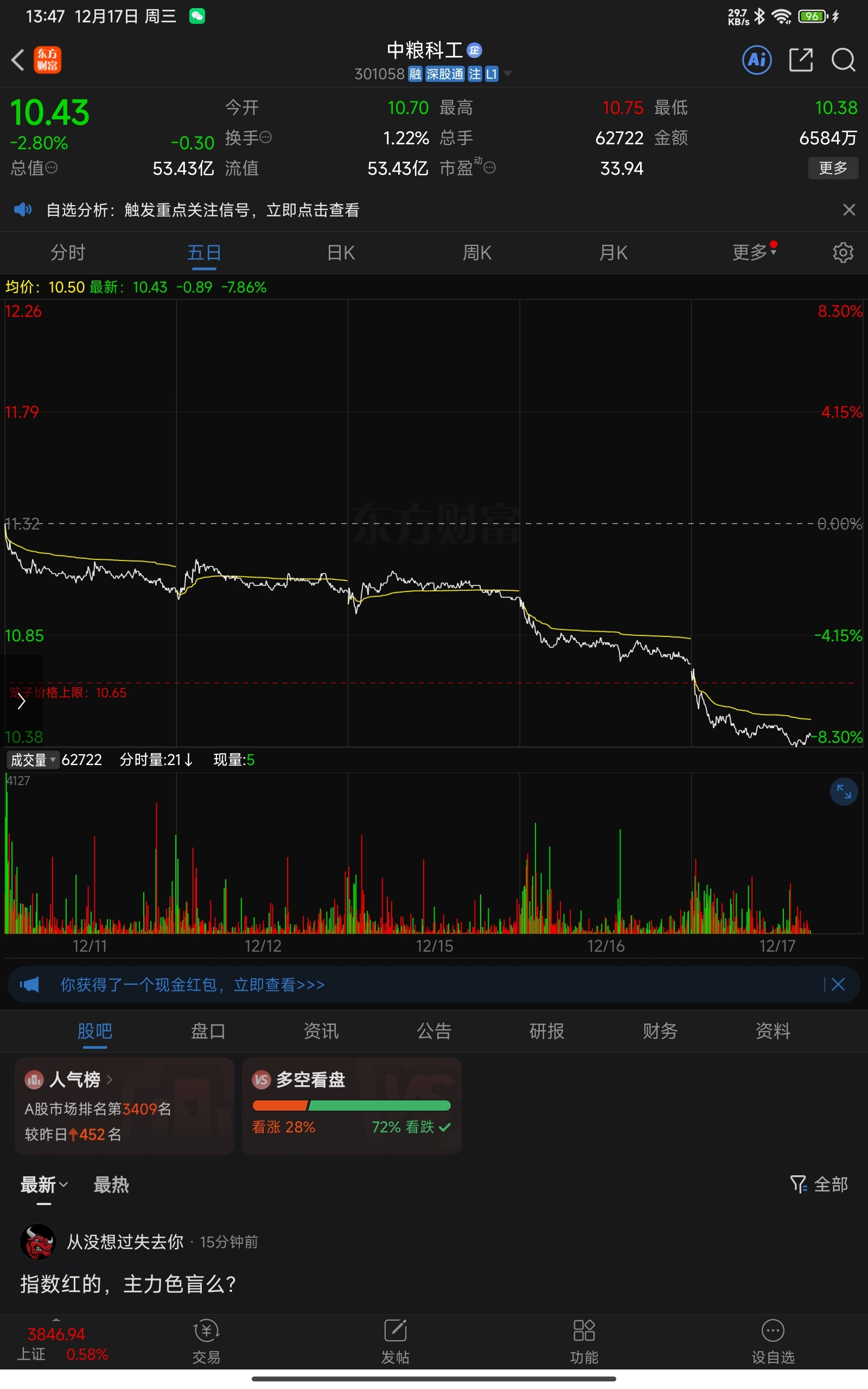 $中粮科工(SZ301058)$ 你是真要脸,大盘跌你跟着跌,大盘涨,你还跌。