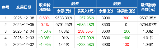 兰卫医学:融资净偿还257.95万元,融资余额9533.3万元(12-08)