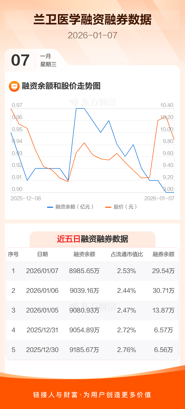 兰卫医学:融资净偿还53.51万元,融资余额8985.65万元