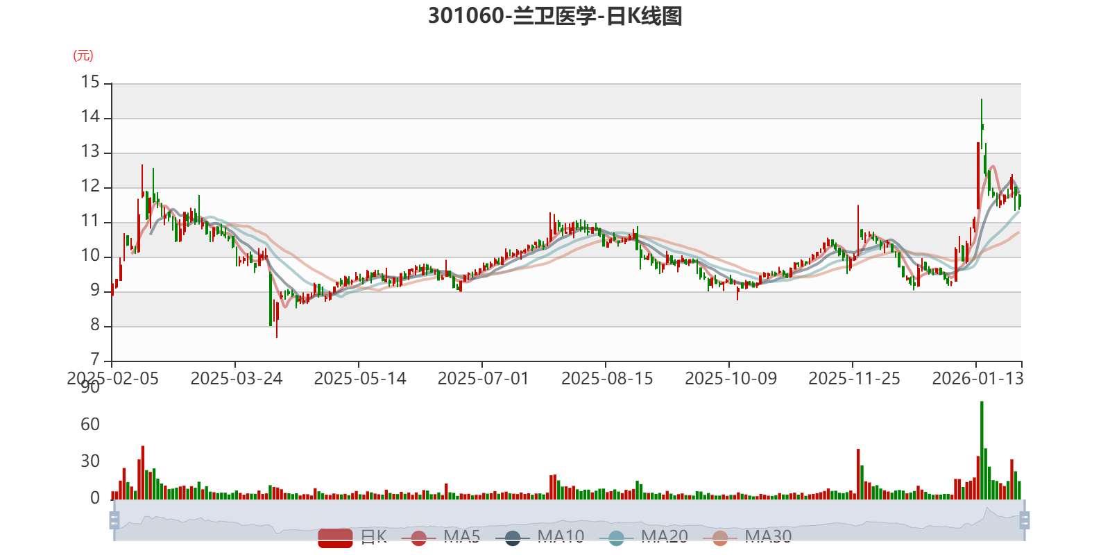中证智能财讯兰卫医学(301060)1月28日晚间披露2025年度业绩预告,预计2025年归母净利润亏损2000万元至3800万元,上年同期亏损1.09亿元;扣非净利润亏损2900万元至5500万元,上年同期亏损1.09亿元。以最新收盘价计算,市净率(LF)约2.91倍,市销率(TTM)约3.01倍。