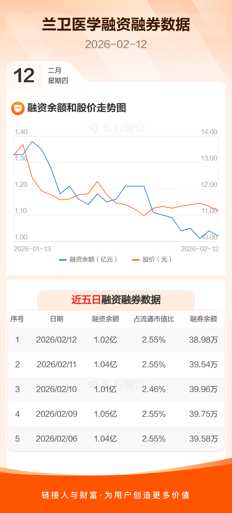 交易所最新数据显示,兰卫医学于2026年2月12日获融资买入428.99万元,融资偿还601.77万元,当日融资净偿还172.77万元。目前,该股融资余额1.02亿,占流通市值比例为2.55%。