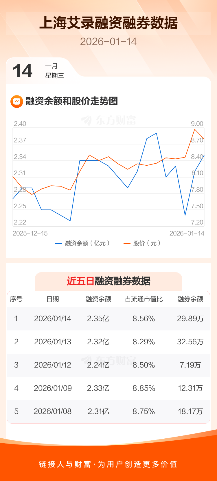 交易所最新数据显示,上海艾录于2026年1月14日获融资买入2072.91万元,融资偿还1787.14万元,当日融资净买入285.77万元。目前,该股融资余额2.35亿,占流通市值比例为8.56%。