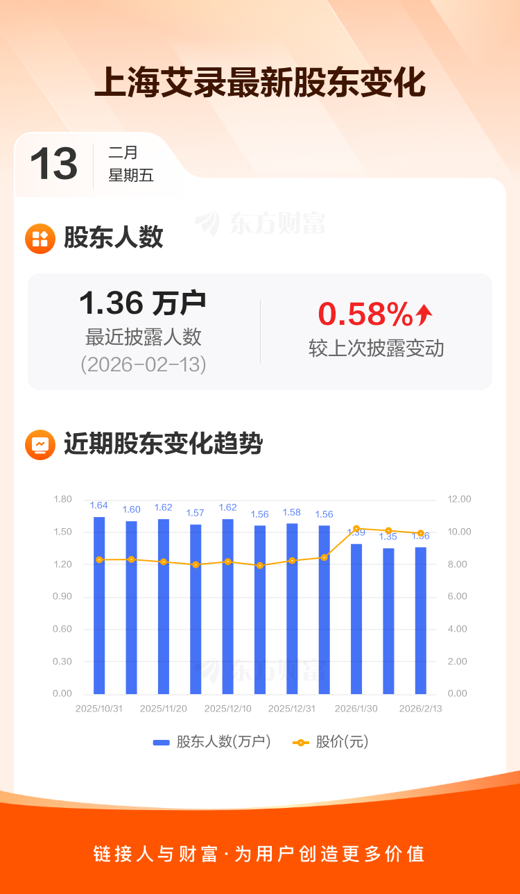 上海艾录最新披露数据显示,截至2月13日公司股东户数为1.36万户,较上期(2026年2月10日)增加78户,增幅为0.58%。户均持有流通股数量由上期的2.31万股下降至2.29万股,户均持股金额由上期的23.27万元减少至22.77万元。