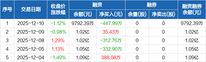 海锅股份:融资净偿还447.99万元,融资余额9792.39万元(12-10)