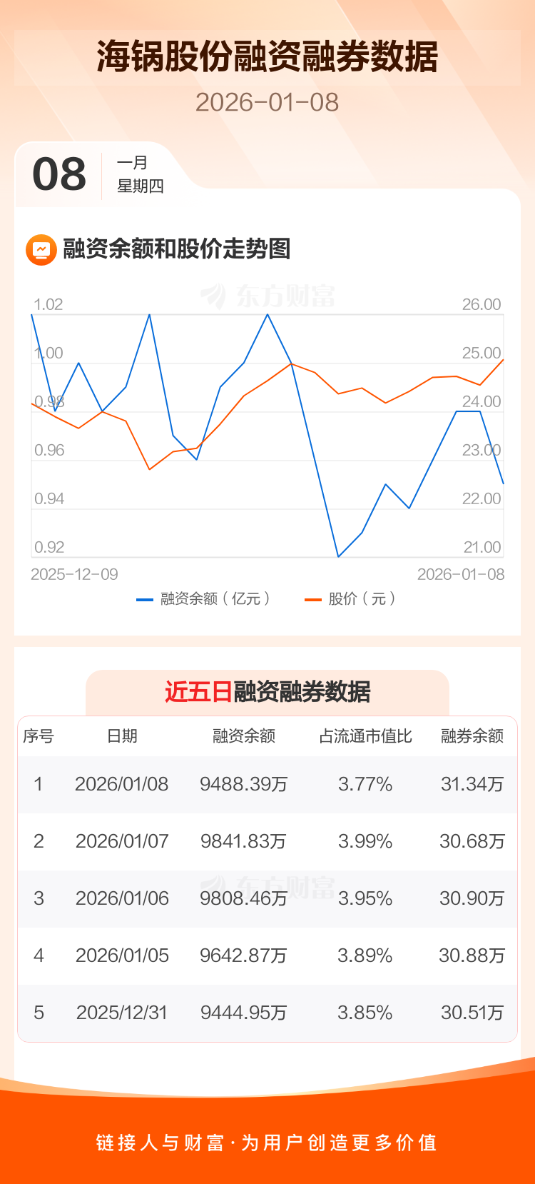 交易所最新数据显示,海锅股份于2026年1月8日获融资买入878.27万元,融资偿还1231.71万元,当日融资净偿还353.44万元。目前,该股融资余额9488.39万,占流通市值比例为3.77%。