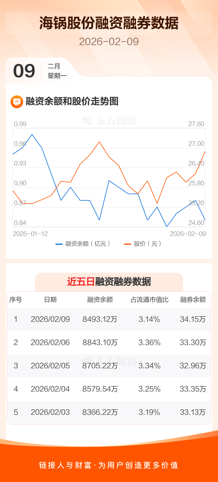 交易所最新数据显示,海锅股份于2026年2月9日获融资买入498.63万元,融资偿还848.61万元,当日融资净偿还349.98万元。目前,该股融资余额8493.12万,占流通市值比例为3.14%。