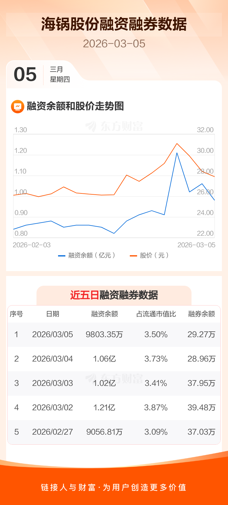 交易所最新数据显示,海锅股份于2026年3月5日获融资买入1946.06万元,融资偿还2772.33万元,当日融资净偿还826.27万元。目前,该股融资余额9803.35万,占流通市值比例为3.50%。