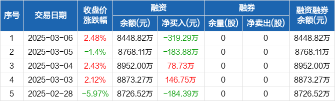 万事利:融资净偿还319.29万元,融资余额8448.82万元(03-06)