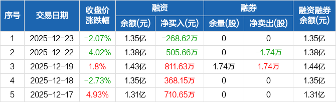万事利:融资净偿还268.62万元,融资余额1.35亿元(12-23)