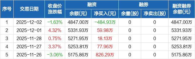 大地海洋:融资净偿还484.93万元,融资余额4847万元(12-02)