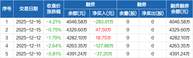 大地海洋:融资净偿还283.01万元,融资余额4046.58万元(12-16)
