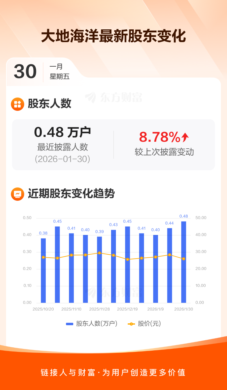 大地海洋最新披露数据显示,截至1月30日公司股东户数为4756户,较上期(2026年1月20日)增加384户,增幅为8.78%。户均持有流通股数量由上期的2.31万股下降至2.12万股,户均持股金额由上期的65.28万元减少至54.92万元。