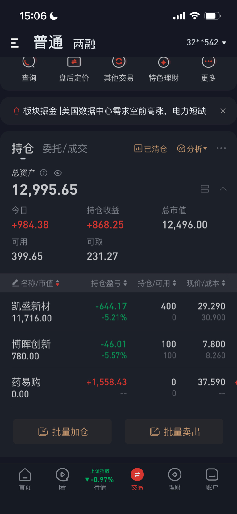 $凯盛新材(SZ301069)$ 早盘看到医药第二个板了,就清仓了药易购,但是还有100股的驳回创新让我陷入了困难,想要卖个好价钱,结果发现100股有没有对买凯胜新材没关系,想要买的时候,分时拉起来,但是发现骇客和花生的分时还在下,就像等一等,等到拉升最高,心态不甘心,又参考了其他的分时就追高了凯胜…………再好的预期也抵不过这双没执行力的手啊……反思一下