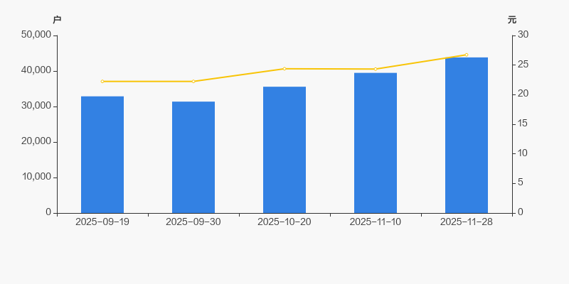 自2025年9月30日以来,公司股东户数连续3期上涨,截至目前增幅为39.70%。2025年9月30日至2025年11月28日区间股价上涨20.22%。