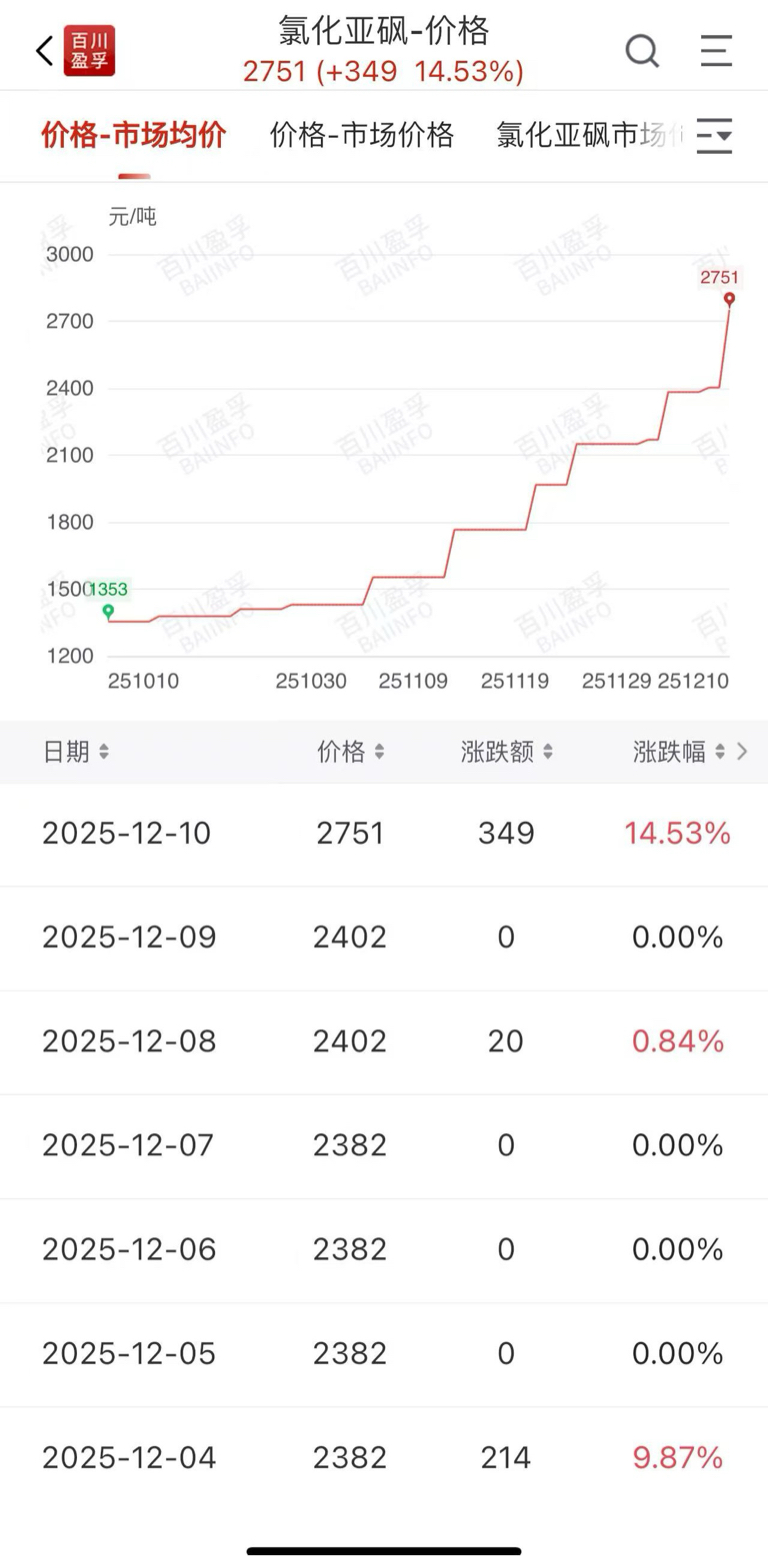 $凯盛新材(SZ301069)$ 12/10氯化亚砜涨幅:14.53%